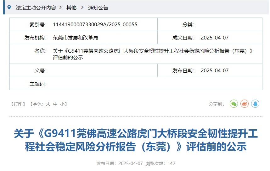 近日,东莞市发展和改革局发布相关公告,公告称,虎门大桥段多座桥梁在长期重载车流下,承载能力不满足要求,耐久性显著下降。根据《交通运输部关于进一步提升公路防灾减灾能力的指导意见》(交公路发〔2024〕76号),计划开展莞佛高速公路虎门大桥段安全韧性提升工作,从而提升虎门大桥段安全韧性、恢复通道交通功能、保证结构安全耐久。